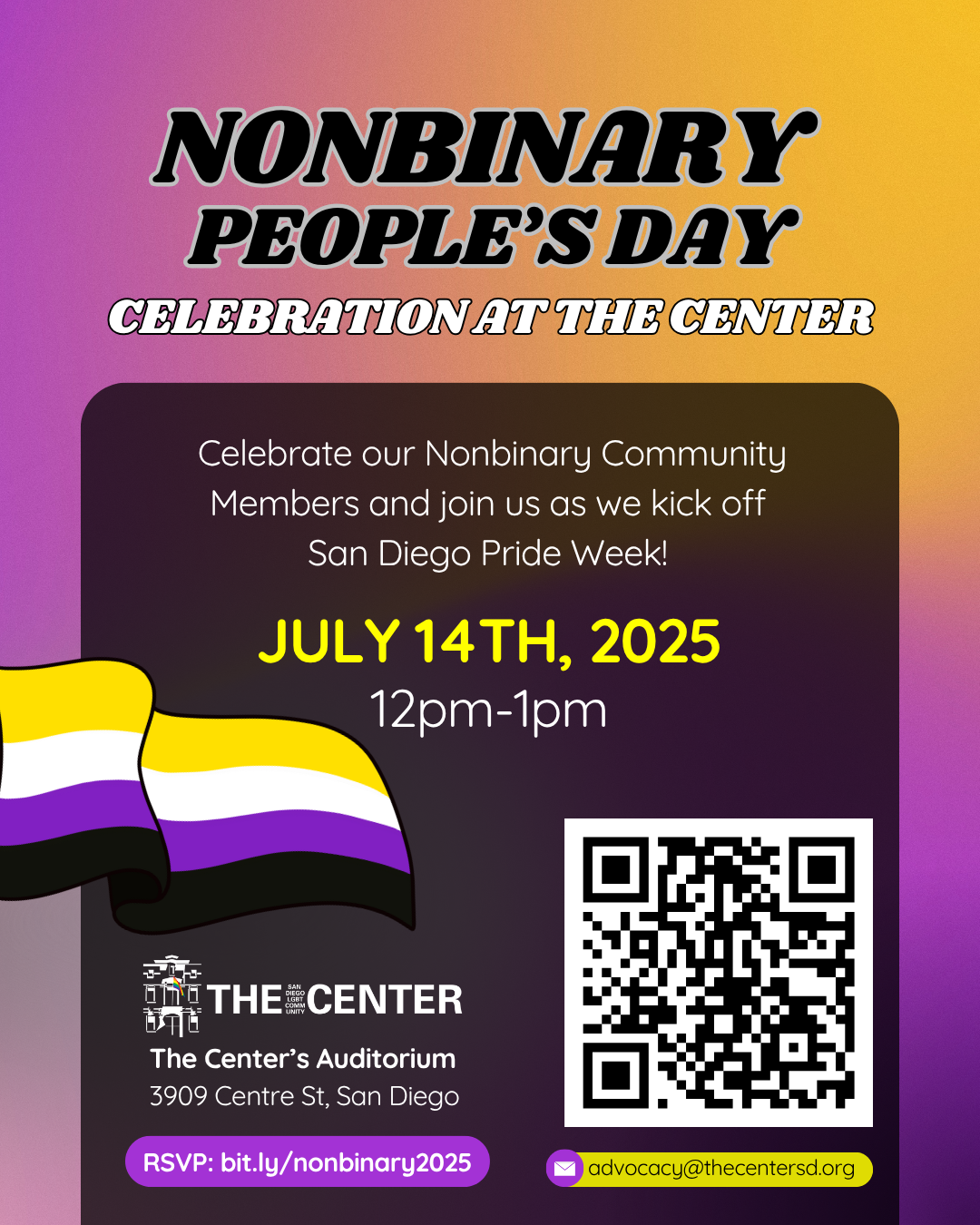 “Celebrate our nonbinary community members and join us as we kick off San Diego Pride Week! We will host a community gathering at The Center to celebrate our nonbinary community members during Nonbinary Awareness Week.”